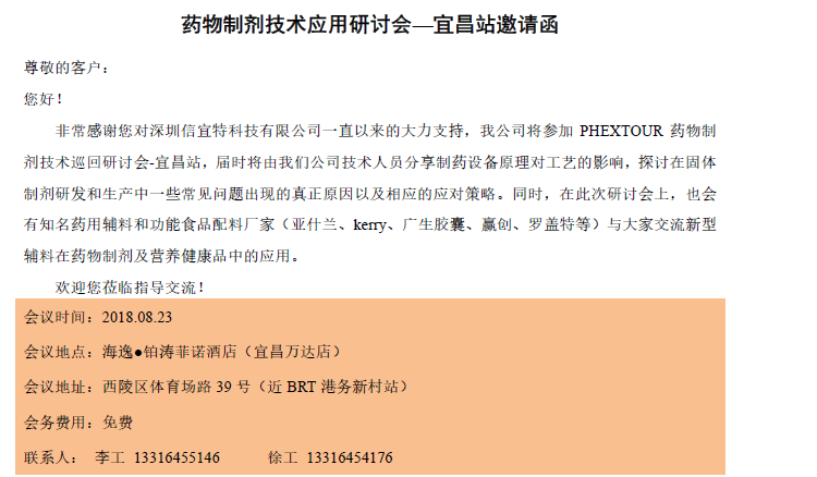 非常感謝您對(duì)深圳信宜特科技有限公司一直以來的大力支持,我公司將參加PHEXTOUR藥物制 劑技術(shù)巡回研討會(huì)宜昌站,屆時(shí)將由我們公司技術(shù)人員分享制藥設(shè)備原理對(duì)工藝的影響,探討在固體 制劑研發(fā)和生產(chǎn)中一些常見問題出現(xiàn)的真正原因以及相應(yīng)的應(yīng)對(duì)策略。同時(shí),在此次研討會(huì)上,也會(huì) 有知名藥用輔料和功能食品配料廠家(亞什蘭、kenry、 廣生膠囊、贏創(chuàng)、羅蓋特等)與大家交流新型 輔料在藥物制劑及營養(yǎng)健康品中的應(yīng)用。